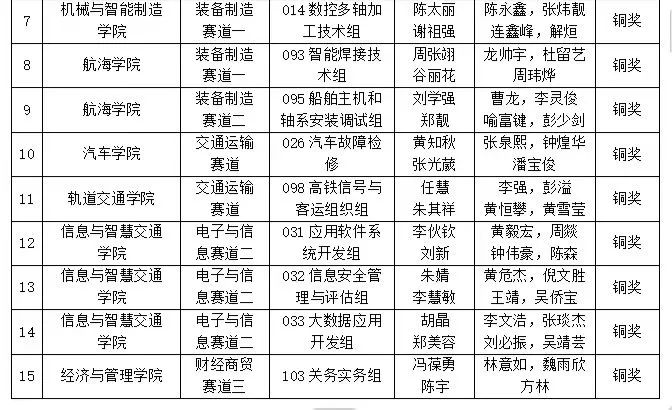 在激烈的競賽中,我院學(xué)子沉著冷靜,發(fā)揮出色,勇獲佳績。在會計(jì)實(shí)務(wù)、電子商務(wù)2個(gè)賽項(xiàng)榮獲金獎(jiǎng),在生產(chǎn)事故應(yīng)急救援、智能飛行器應(yīng)用技術(shù)、智能網(wǎng)聯(lián)汽車技術(shù)、機(jī)器人系統(tǒng)集成應(yīng)用技術(shù)4個(gè)賽項(xiàng)榮獲銀獎(jiǎng),在數(shù)控多軸加工技術(shù)、智能焊接技術(shù)、船舶主機(jī)和軸系安裝調(diào)試、汽車故障檢修、高鐵信號與客運(yùn)組織、應(yīng)用軟件系統(tǒng)開發(fā)、信息安全管理與評估、大數(shù)據(jù)應(yīng)用開發(fā)、關(guān)務(wù)實(shí)務(wù)9個(gè)賽項(xiàng)榮獲銅獎(jiǎng),獲獎(jiǎng)數(shù)量位居全省第一。同時(shí)受我院邀請,由烏干達(dá)工程機(jī)械技能培訓(xùn)中心組成的國際代表隊(duì),在我院汽車學(xué)院黃林火老師的指導(dǎo)下,榮獲交通運(yùn)輸賽道起動系統(tǒng)故障排查小組銅獎(jiǎng)。