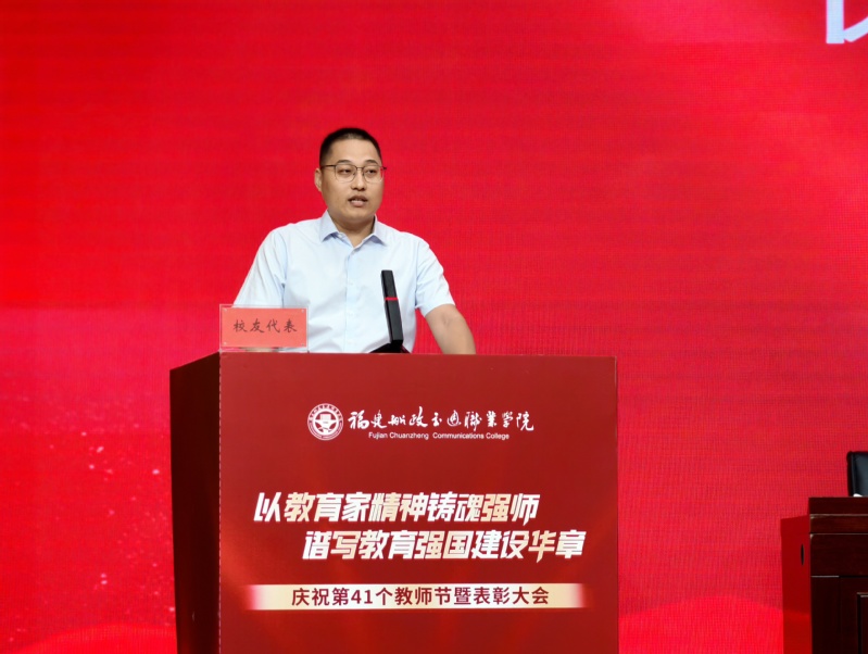 來自安全與環(huán)境學(xué)院24級安全技術(shù)與管理專業(yè)的劉濱福同學(xué),作為學(xué)生代表為全體教師送上真摯祝福,他分享了自己從軍旅到重返校園的心路歷程,感謝老師們的悉心教導(dǎo),并表示將以更加堅(jiān)定的信念和實(shí)際行動(dòng)回報(bào)師恩、不負(fù)青春。