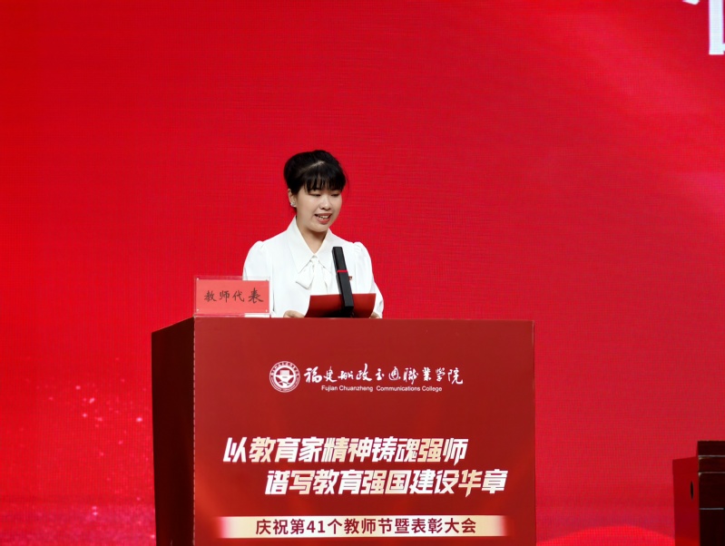 9月10日下午,我院舉行慶祝第41個(gè)教師節(jié)暨表彰大會。黨委書記陳宜大,黨委副書記、院長陳群,黨委副書記張輝,紀(jì)委書記謝建山,副院長陳常暉出席會議。會議由陳常暉主持。全體教職工、榮退人員代表、福建閩清職業(yè)中專學(xué)校代表、校友代表、學(xué)生代表歡聚一堂,共同參加此次會議。本次慶祝表彰大會采用線下會場和線上直播同步進(jìn)行。