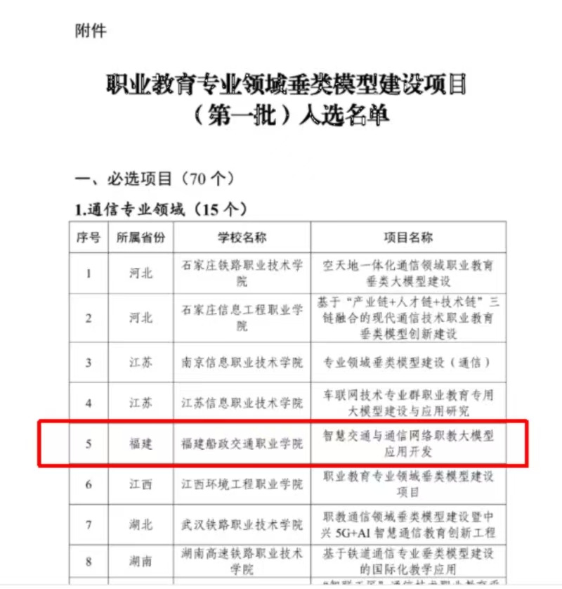 近日,教育部職業(yè)教育發(fā)展中心公布了“職業(yè)教育專業(yè)領域垂類模型建設項目(第一批)”入選名單,由我院信息與智慧交通學院團隊申報的“智慧交通與通信網(wǎng)絡職教大模型應用開發(fā)”項目成功入選,成為通信專業(yè)領域重點建設項目之一。