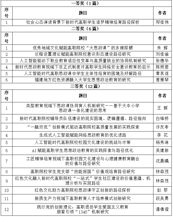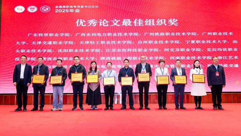 會議圍繞“認真學習貫徹黨的二十屆四中全會精神,落實教育強國建設規(guī)劃綱要,開創(chuàng)新時代高職院校黨的建設和思政教育新局面”,深入探討新時代高職院校黨的建設與思想政治工作高質(zhì)量發(fā)展路徑,為推進教育現(xiàn)代化和強國建設凝聚廣泛共識與行動力量。會議期間,全國高職高專黨委書記論壇公布2025年獲獎論文,我院選送的19篇論文獲獎,其中一等獎1篇,二等獎6篇,三等獎12篇,我院獲評“最佳組織獎”。在“思想政治”論壇上,我院輔導員鄭佳偉以《社會心態(tài)演進背景下新時代高職學生逐夢精神培育路徑探析》為題作經(jīng)驗分享。