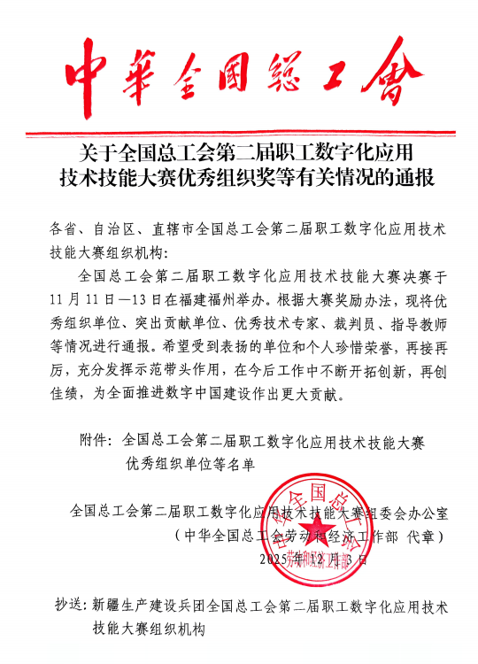近日,中華全國總工會發(fā)布通報,表揚(yáng)在全國總工會第二屆職工數(shù)字化應(yīng)用技術(shù)技能大賽中表現(xiàn)突出的單位和個人,我院榮獲“突出貢獻(xiàn)單位”榮譽(yù)。