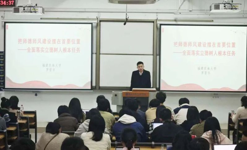 師德師風(fēng)是教師隊(duì)伍建設(shè)的靈魂,福建農(nóng)林大學(xué)馬克思主義學(xué)院羅賢宇教授在《把師德師風(fēng)建設(shè)擺在首要位置——全面落實(shí)立德樹(shù)人根本任務(wù)》專(zhuān)題講座中,報(bào)告深入解讀了新時(shí)代教師職業(yè)行為準(zhǔn)則,結(jié)合典型案例,強(qiáng)調(diào)了筑牢師德底線、關(guān)愛(ài)學(xué)生成長(zhǎng)、恪守學(xué)術(shù)道德的重要性。講座引導(dǎo)新教師們深刻思考“為誰(shuí)培養(yǎng)人、培養(yǎng)什么人、怎樣培養(yǎng)人”這一根本問(wèn)題,激勵(lì)大家爭(zhēng)做“四有”好老師,將立德樹(shù)人根本任務(wù)內(nèi)化于心、外化于行。