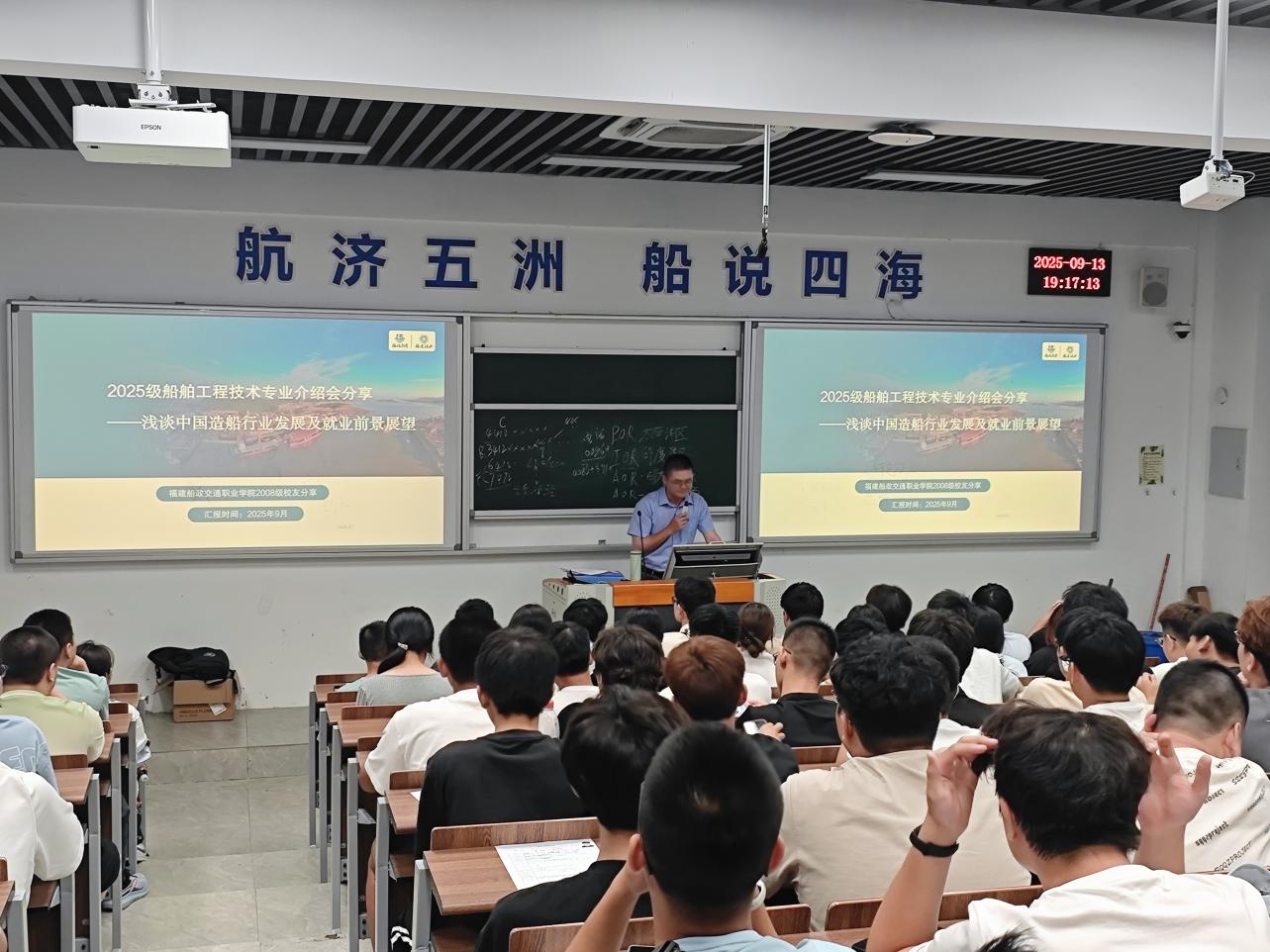 本次介紹會(huì)特邀畢業(yè)于福建船政交通職業(yè)技術(shù)學(xué)院、現(xiàn)任福建船政重工股份有限公司的優(yōu)秀校友-王亞峰學(xué)長回校分享。他結(jié)合個(gè)人成長經(jīng)歷,講述從校園到企業(yè)的蛻變歷程與工作寶貴經(jīng)驗(yàn),鼓勵(lì)同學(xué)們珍惜在校時(shí)光、扎實(shí)學(xué)習(xí)專業(yè)知識(shí)并積極參與實(shí)踐項(xiàng)目;同時(shí)圍繞國家海洋強(qiáng)國戰(zhàn)略和造船產(chǎn)業(yè)政策,分析行業(yè)發(fā)展新機(jī)遇,強(qiáng)調(diào)船舶工程技術(shù)人才對制造業(yè)高質(zhì)量發(fā)展的重要作用,還以詳實(shí)數(shù)據(jù)和案例淺析國內(nèi)外造船行業(yè)在綠色船舶、智能造船、高端裝備制造等方向的發(fā)展現(xiàn)狀與趨勢,幫助同學(xué)們建立行業(yè)前景宏觀認(rèn)知,并展望就業(yè)前景,指出海洋經(jīng)濟(jì)升溫與科技革命深入背景下,船舶設(shè)計(jì)與制造、工藝管理、質(zhì)量檢驗(yàn)等崗位需求將持續(xù)增長,就業(yè)前景廣闊。