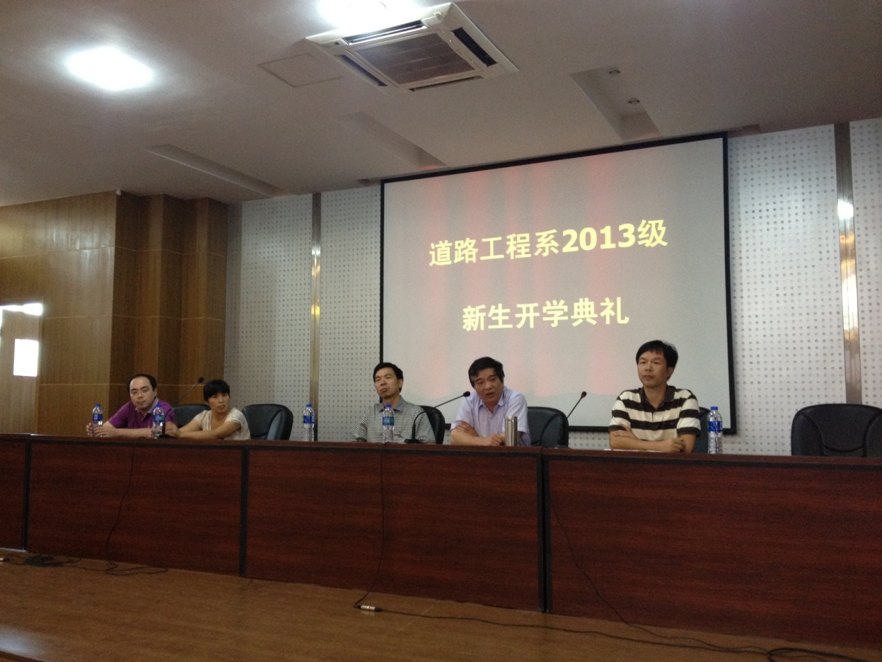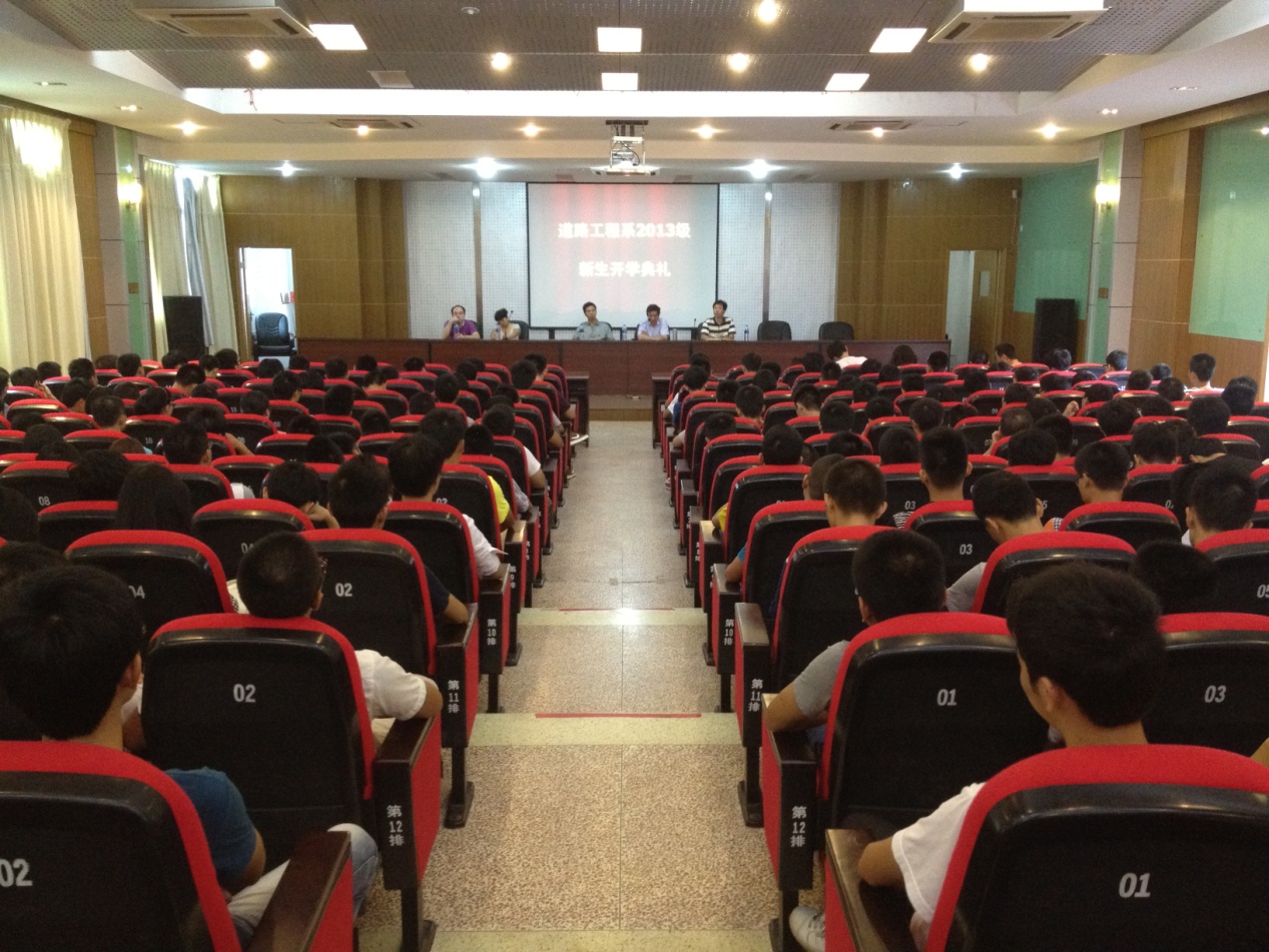 2013年9月12日下午4:30,道路工程系2013級新生開學典禮在一號樓六樓學術報告廳召開。道路工程系書記王心金、系主任周志堅、俞素平副教授、陳勇鋒老師、陳艷瓊老師、全體輔導員以及300多名學生參加了會議。