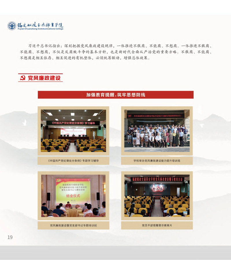 十九大以來,福建船政交通職業(yè)學(xué)院堅持以習(xí)近平新時代中國特色社會主義思想為指導(dǎo),堅持社會主義辦學(xué)方向,深入貫徹黨的十九大和十九屆歷次全會精神,堅守“為黨育人、為國育才”的初心和使命,慎終如始推進(jìn)學(xué)校黨的政治建設(shè)、思想建設(shè)、組織建設(shè)、作風(fēng)建設(shè)、紀(jì)律建設(shè)、制度建設(shè),黨的組織體系和學(xué)校治理體系相得益彰,黨建引領(lǐng)推動創(chuàng)新船政、質(zhì)量船政、文化船政協(xié)奏齊鳴,政治生態(tài)、學(xué)術(shù)生態(tài)、文化生態(tài)持續(xù)向好,辦學(xué)效率、辦學(xué)效能、辦學(xué)效益顯著提升!