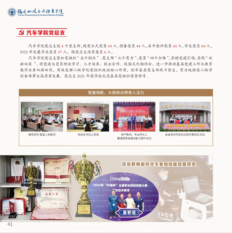 十九大以來,福建船政交通職業(yè)學(xué)院堅持以習(xí)近平新時代中國特色社會主義思想為指導(dǎo),堅持社會主義辦學(xué)方向,深入貫徹黨的十九大和十九屆歷次全會精神,堅守“為黨育人、為國育才”的初心和使命,慎終如始推進(jìn)學(xué)校黨的政治建設(shè)、思想建設(shè)、組織建設(shè)、作風(fēng)建設(shè)、紀(jì)律建設(shè)、制度建設(shè),黨的組織體系和學(xué)校治理體系相得益彰,黨建引領(lǐng)推動創(chuàng)新船政、質(zhì)量船政、文化船政協(xié)奏齊鳴,政治生態(tài)、學(xué)術(shù)生態(tài)、文化生態(tài)持續(xù)向好,辦學(xué)效率、辦學(xué)效能、辦學(xué)效益顯著提升!