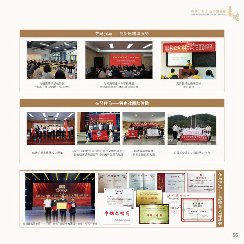 十九大以來,福建船政交通職業(yè)學(xué)院堅持以習(xí)近平新時代中國特色社會主義思想為指導(dǎo),堅持社會主義辦學(xué)方向,深入貫徹黨的十九大和十九屆歷次全會精神,堅守“為黨育人、為國育才”的初心和使命,慎終如始推進(jìn)學(xué)校黨的政治建設(shè)、思想建設(shè)、組織建設(shè)、作風(fēng)建設(shè)、紀(jì)律建設(shè)、制度建設(shè),黨的組織體系和學(xué)校治理體系相得益彰,黨建引領(lǐng)推動創(chuàng)新船政、質(zhì)量船政、文化船政協(xié)奏齊鳴,政治生態(tài)、學(xué)術(shù)生態(tài)、文化生態(tài)持續(xù)向好,辦學(xué)效率、辦學(xué)效能、辦學(xué)效益顯著提升!
