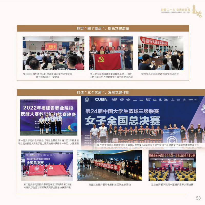 十九大以來,福建船政交通職業(yè)學(xué)院堅持以習(xí)近平新時代中國特色社會主義思想為指導(dǎo),堅持社會主義辦學(xué)方向,深入貫徹黨的十九大和十九屆歷次全會精神,堅守“為黨育人、為國育才”的初心和使命,慎終如始推進學(xué)校黨的政治建設(shè)、思想建設(shè)、組織建設(shè)、作風(fēng)建設(shè)、紀律建設(shè)、制度建設(shè),黨的組織體系和學(xué)校治理體系相得益彰,黨建引領(lǐng)推動創(chuàng)新船政、質(zhì)量船政、文化船政協(xié)奏齊鳴,政治生態(tài)、學(xué)術(shù)生態(tài)、文化生態(tài)持續(xù)向好,辦學(xué)效率、辦學(xué)效能、辦學(xué)效益顯著提升!