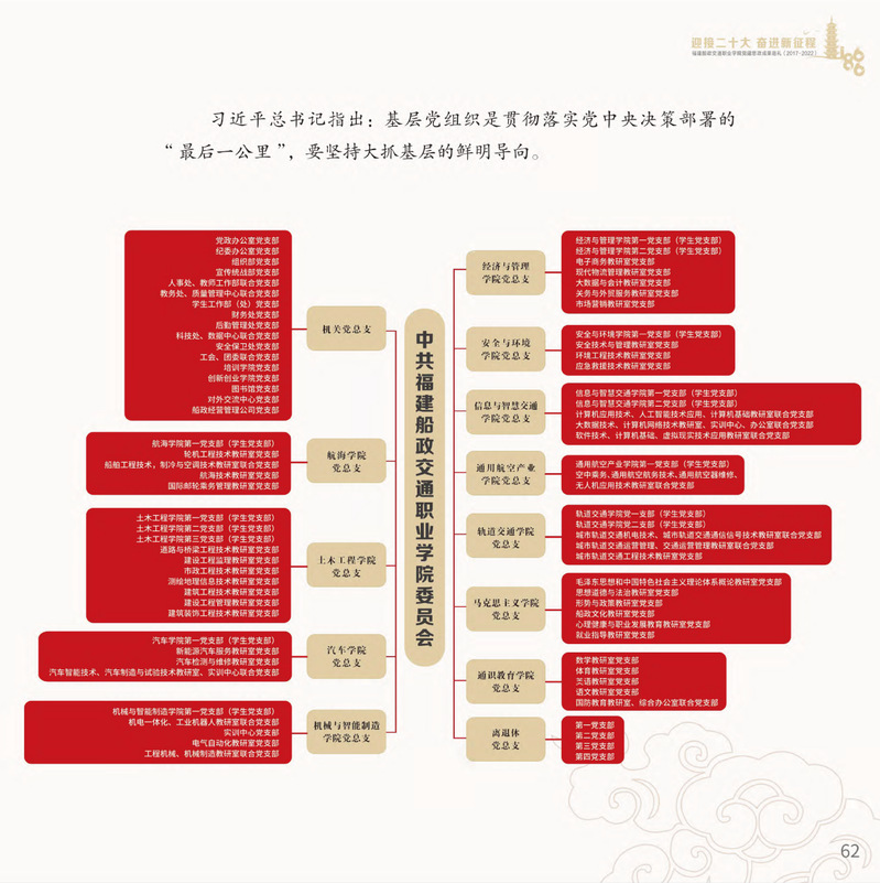 十九大以來,福建船政交通職業(yè)學(xué)院堅(jiān)持以習(xí)近平新時(shí)代中國特色社會主義思想為指導(dǎo),堅(jiān)持社會主義辦學(xué)方向,深入貫徹黨的十九大和十九屆歷次全會精神,堅(jiān)守“為黨育人、為國育才”的初心和使命,慎終如始推進(jìn)學(xué)校黨的政治建設(shè)、思想建設(shè)、組織建設(shè)、作風(fēng)建設(shè)、紀(jì)律建設(shè)、制度建設(shè),黨的組織體系和學(xué)校治理體系相得益彰,黨建引領(lǐng)推動創(chuàng)新船政、質(zhì)量船政、文化船政協(xié)奏齊鳴,政治生態(tài)、學(xué)術(shù)生態(tài)、文化生態(tài)持續(xù)向好,辦學(xué)效率、辦學(xué)效能、辦學(xué)效益顯著提升!