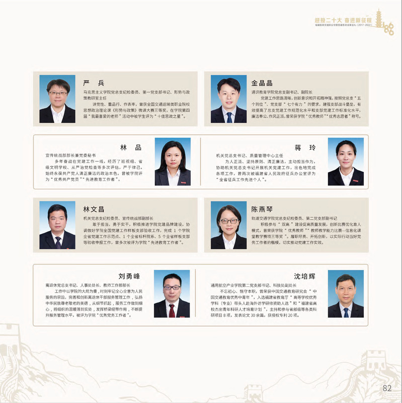 十九大以來,福建船政交通職業(yè)學(xué)院堅持以習(xí)近平新時代中國特色社會主義思想為指導(dǎo),堅持社會主義辦學(xué)方向,深入貫徹黨的十九大和十九屆歷次全會精神,堅守“為黨育人、為國育才”的初心和使命,慎終如始推進學(xué)校黨的政治建設(shè)、思想建設(shè)、組織建設(shè)、作風(fēng)建設(shè)、紀(jì)律建設(shè)、制度建設(shè),黨的組織體系和學(xué)校治理體系相得益彰,黨建引領(lǐng)推動創(chuàng)新船政、質(zhì)量船政、文化船政協(xié)奏齊鳴,政治生態(tài)、學(xué)術(shù)生態(tài)、文化生態(tài)持續(xù)向好,辦學(xué)效率、辦學(xué)效能、辦學(xué)效益顯著提升! 近期,學(xué)校官微將陸續(xù)推出“學(xué)校黨建思政成果巡禮(2017-2022)”專題系列,邀請您共同回顧學(xué)校過去五年黨建思政工作的發(fā)展歷程。 感召榜樣力量