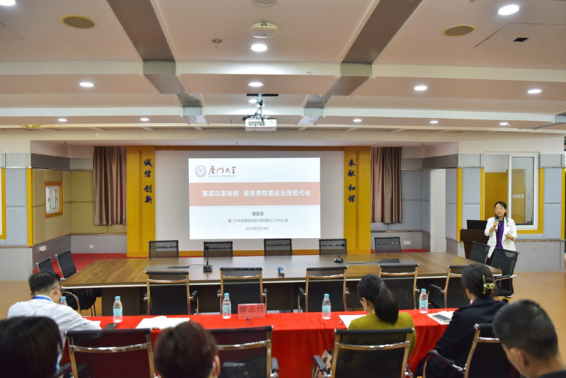 會(huì)議邀請(qǐng)了廈門大學(xué)黨建辦主任、組織部副部長廖志丹做了《落實(shí)議事規(guī)則 推進(jìn)高?;鶎又卫憩F(xiàn)代化》專題輔導(dǎo)報(bào)告會(huì)。廖主任結(jié)合專項(xiàng)檢查、現(xiàn)場推進(jìn)會(huì)以及在廈門大學(xué)開展的議事規(guī)則調(diào)研等所發(fā)現(xiàn)的問題,從解讀《中國共產(chǎn)黨普通高等學(xué)?;鶎咏M織工作條例》入手,對(duì)如何進(jìn)一步規(guī)范二級(jí)學(xué)院領(lǐng)導(dǎo)班子權(quán)力運(yùn)行和決策機(jī)制做了詳細(xì)的專題輔導(dǎo)。