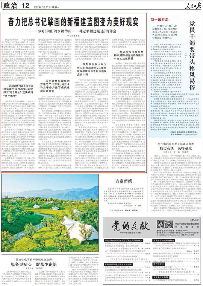 今天,人民日報(bào)刊發(fā)文章《奮力把總書記擘畫的新福建藍(lán)圖變?yōu)槊篮矛F(xiàn)實(shí)——學(xué)習(xí)<閩山閩水物華新——習(xí)近平福建足跡>的體會》,全文如下: