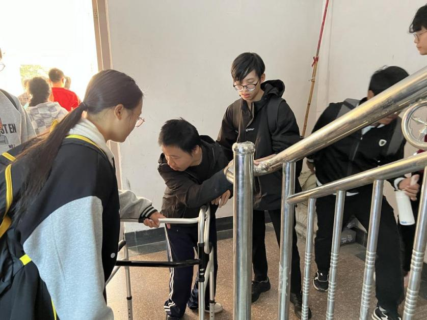 圖11:黨支部學(xué)生黨員幫助殘疾同學(xué)上下樓梯