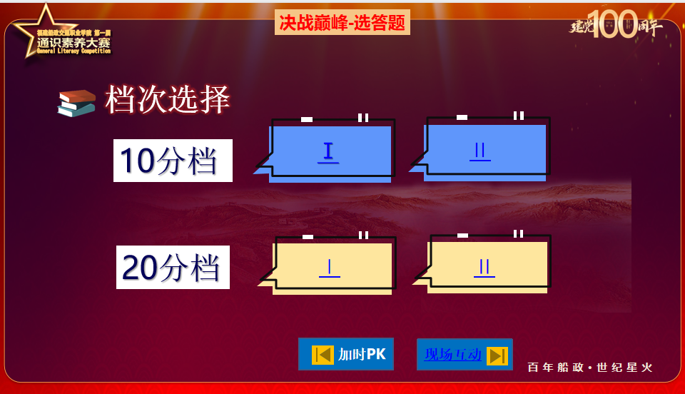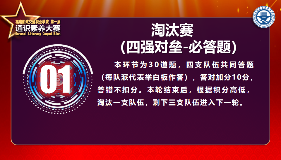 本輪共60題搶答題,使用搶答器搶答、口頭答題。每答對(duì)1題加分10分,答錯(cuò)不扣分。本輪結(jié)束后,根據(jù)積分淘汰一支隊(duì)伍,剩下兩支隊(duì)伍晉級(jí),本輪分?jǐn)?shù)全部清零,每支隊(duì)伍各有100分基礎(chǔ)分進(jìn)入下一輪比拼。
