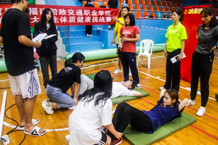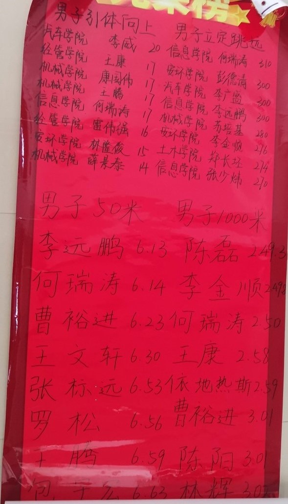 本次挑戰(zhàn)賽測試4個基礎(chǔ)體 能項目,男子組:引體向上、50米、立定跳遠(yuǎn)、1000米。女子組:仰臥起坐、50米、立定跳遠(yuǎn)、800米。各個學(xué)院積極響應(yīng),八個學(xué)院共派出95名精英參加本次比賽,本次比賽有三個環(huán)節(jié),第一環(huán)節(jié)是5月27日晚上測試的立定跳遠(yuǎn)、女子仰臥起坐、男子引體向上。第二個環(huán)節(jié)是6月3日測試50米男子1000米、女子800米,第三個環(huán)節(jié)是6月9日的頒獎儀式。