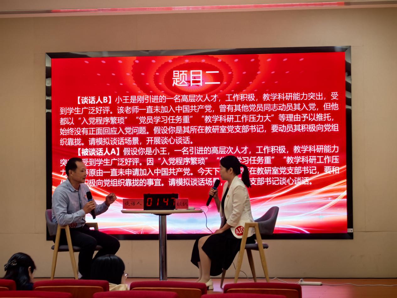 本屆大賽自10月啟動以來,先后完成了“主題黨日策劃”與“黨務(wù)知識測試”兩項賽程。10月22日于藝新樓進行的“談心談話”與“微黨課”環(huán)節(jié)中,通識教育學(xué)院代表隊與各二級學(xué)院優(yōu)秀黨務(wù)干部同場競技,展現(xiàn)出扎實的黨務(wù)功底與職業(yè)素養(yǎng)。