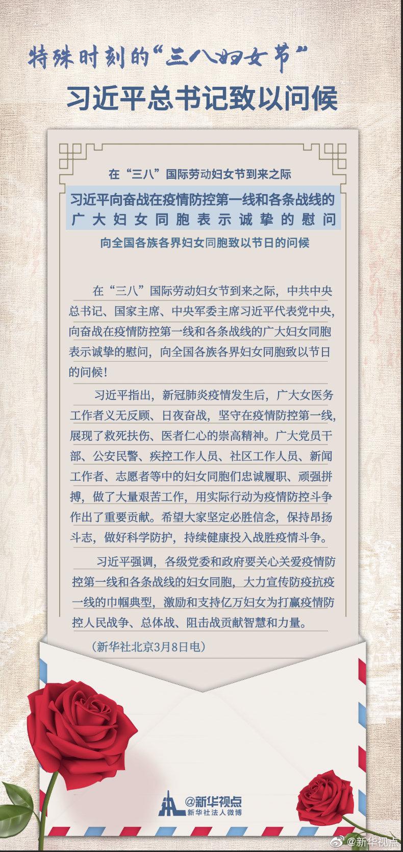 習近平強調,各級黨委和政府要關心關愛疫情防控第一線和各條戰(zhàn)線的婦女同胞,大力宣傳防疫抗疫一線的巾幗典型,激勵和支持億萬婦女為打贏疫情防控人民戰(zhàn)爭、總體戰(zhàn)、阻擊戰(zhàn)貢獻智慧和力量。