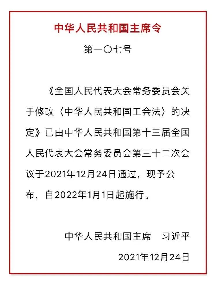 (1992年4月3日第七屆全國人民代表大會第五次會議通過 根據(jù)2001年10月27日第九屆全國人民代表大會常務委員會第二十四次會議《關(guān)于修改〈中華人民共和國工會法〉的決定》第一次修正 根據(jù)2009年8月27日第十一屆全國人民代表大會常務委員會第十次會議《關(guān)于修改部分法律的決定》第二次修正 根據(jù)2021年12月24日第十三屆全國人民代表大會常務委員會第三十二次會議《關(guān)于修改〈中華人民共和國工會法〉的決定》第三次修正)