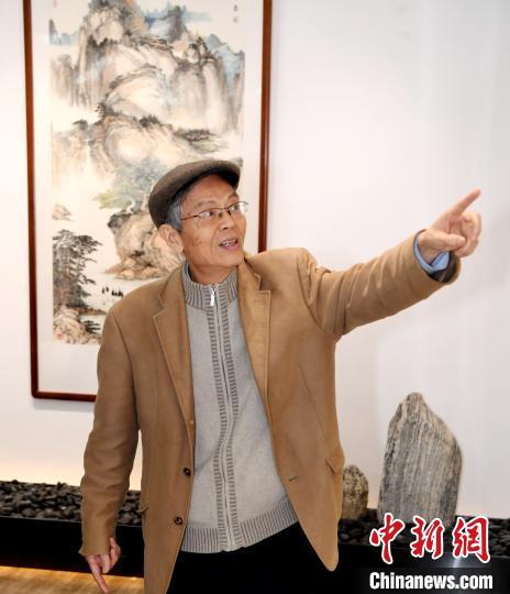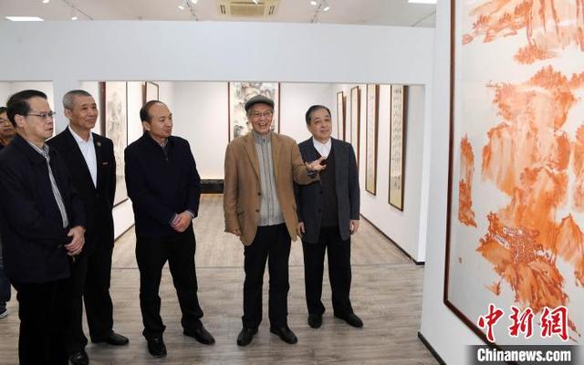 著名藝術家沈巖先生(右二)向來賓介紹在館內(nèi)展出、由他本人創(chuàng)作的80多幅書畫作品。