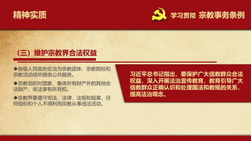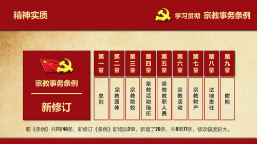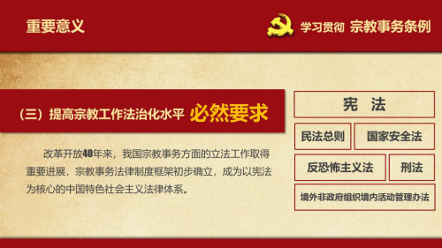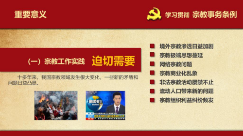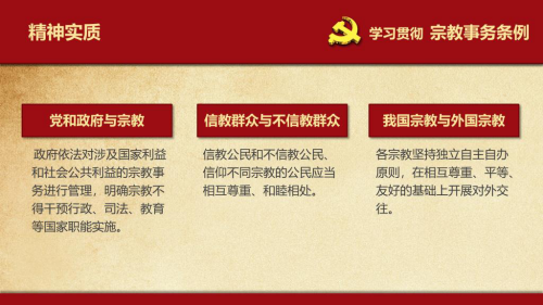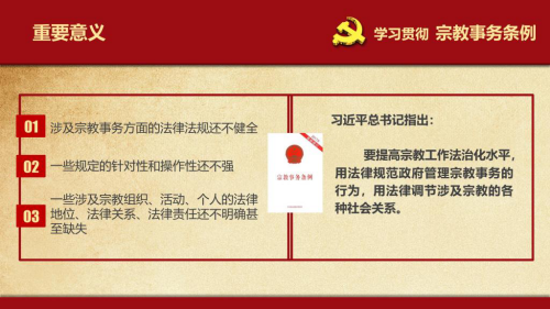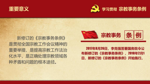 黨的十八大以來,以習近平同志為核心的黨中央高度重視宗教工作,將宗教工作擺上更加重要的議事日程。2016年,黨中央、國務院召開全國宗教工作會議,習近平總書記發(fā)表了重要講話,從黨和國家事業(yè)發(fā)展全局的戰(zhàn)略高度,科學分析了宗教工作面臨的形勢和任務,就宗教問題和宗教工作提出了一系列新思想新觀點新要求,為加強和改進新形勢下的宗教工作指明了方向、提供了遵循。 新修訂的《宗教事務條例》于2018年2月1日正式實施。出臺新修訂的《條例》,是貫徹全國宗教工作會議精神的重要舉措,對推進我國宗教工作法治化進程具有十分重要的意義。