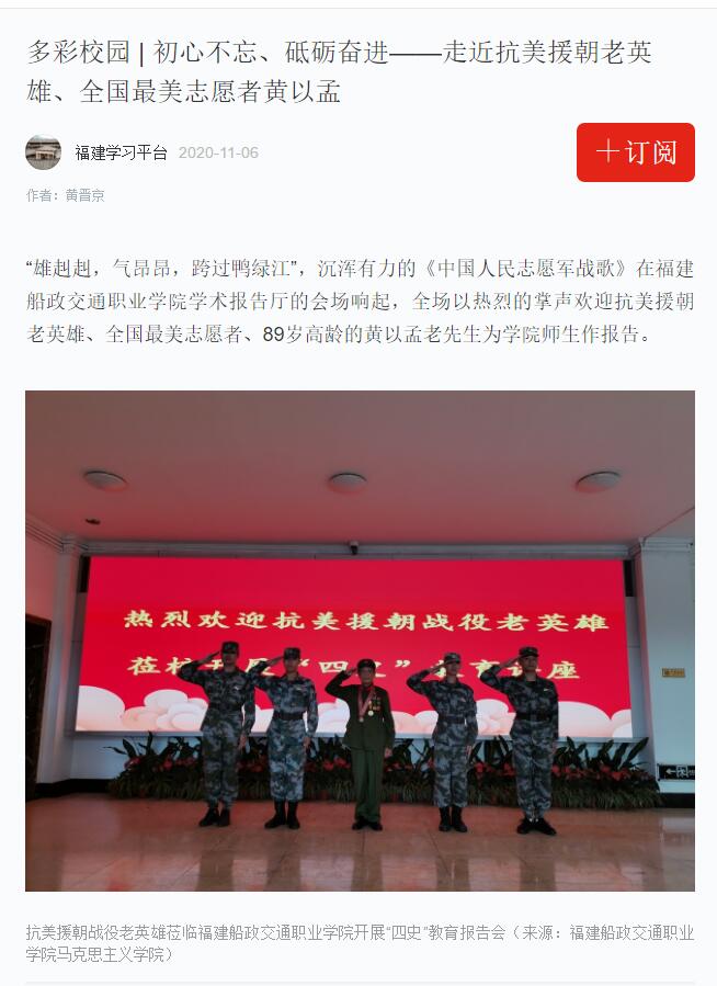 “雄赳赳,氣昂昂,跨過(guò)鴨綠江”,沉渾有力的《中國(guó)人民志愿軍戰(zhàn)歌》在福建船政交通職業(yè)學(xué)院學(xué)術(shù)報(bào)告廳的會(huì)場(chǎng)響起,全場(chǎng)以熱烈的掌聲歡迎抗美援朝老英雄、全國(guó)最美志愿者、89歲高齡的黃以孟老先生為學(xué)院師生作報(bào)告。