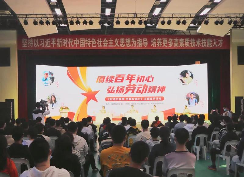 11月10日,由福建省總工會(huì)主辦、我院和人民網(wǎng)福建頻道承辦的“對(duì)話價(jià)值觀 勞模校園行”大型主題宣講活動(dòng)在我院文體中心隆重舉行。福建省教科文衛(wèi)體工會(huì)工委主任郭立新、一級(jí)調(diào)研員蘇龍、學(xué)院黨委副書記陳宜大出席活動(dòng),學(xué)院相關(guān)部門、各二級(jí)學(xué)院負(fù)責(zé)人以及師生代表近300人參加。