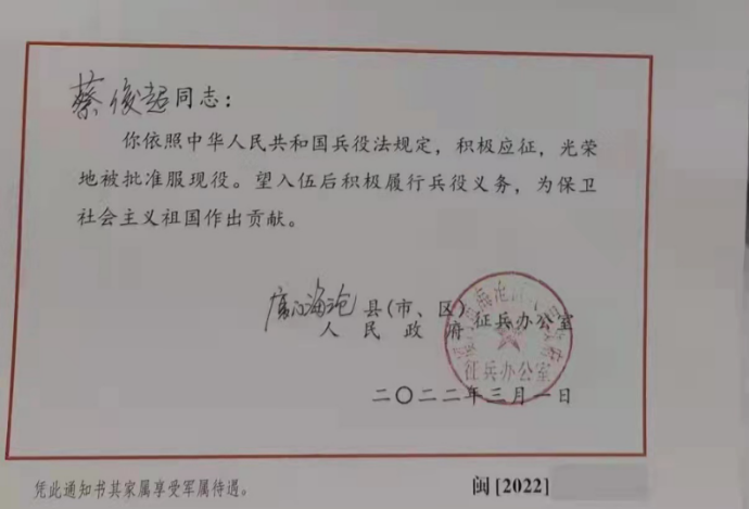 2022年1月,即將大學(xué)畢業(yè)的他毅然決定再次報(bào)名應(yīng)征,決定畢業(yè)季二次入伍,再續(xù)軍旅情緣,用自己的實(shí)際行動(dòng)續(xù)寫保家衛(wèi)國(guó)的榮光。