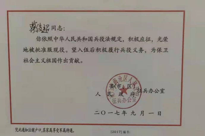 戎涯無(wú)悔,熱血青年志在軍營(yíng),祝福蔡俊超同學(xué)一切順利,實(shí)現(xiàn)“二次入伍“夢(mèng),在火熱的軍營(yíng)創(chuàng)造精彩人生!