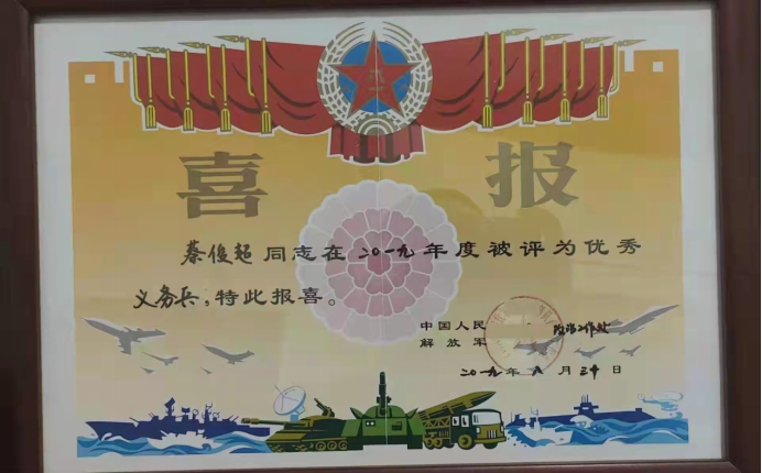 在第一次入伍期間,他對(duì)自己嚴(yán)格要求,憑借著自己強(qiáng)大的毅力和好強(qiáng)的性格,刻苦訓(xùn)練,很快在隊(duì)伍中脫穎而出,榮獲“優(yōu)秀義務(wù)兵”稱號(hào)。