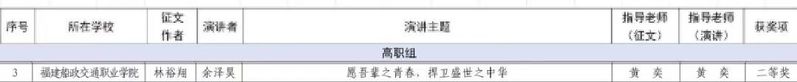 日前,中共福建省委教育工委印發(fā)《關(guān)于公布第六屆“馬克思主義能夠給予我們什么”福建省高校大學(xué)生主題征文和微演講活動(dòng)獲獎(jiǎng)名單的通知》。經(jīng)高校推薦、專家評(píng)審、網(wǎng)上公示等環(huán)節(jié),省委教育工委評(píng)選出第六屆“馬克思主義能夠給予我們什么”福建省高校大學(xué)生主題征文和微演講活動(dòng)獲獎(jiǎng)名單,我校作品《愿吾輩之青春,捍衛(wèi)盛世之中華》(征文作者:林裕翔,演講者:余澤昊,指導(dǎo)教師:黃奕)獲二等獎(jiǎng)。