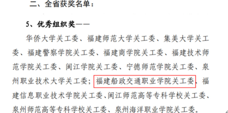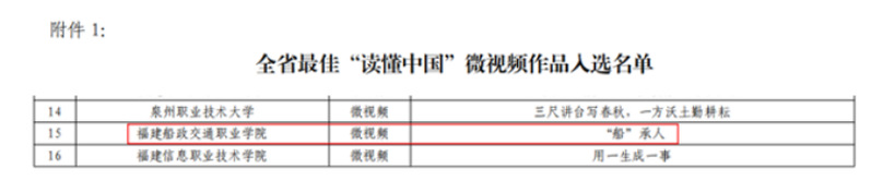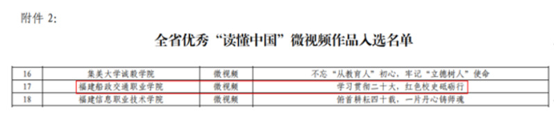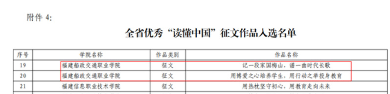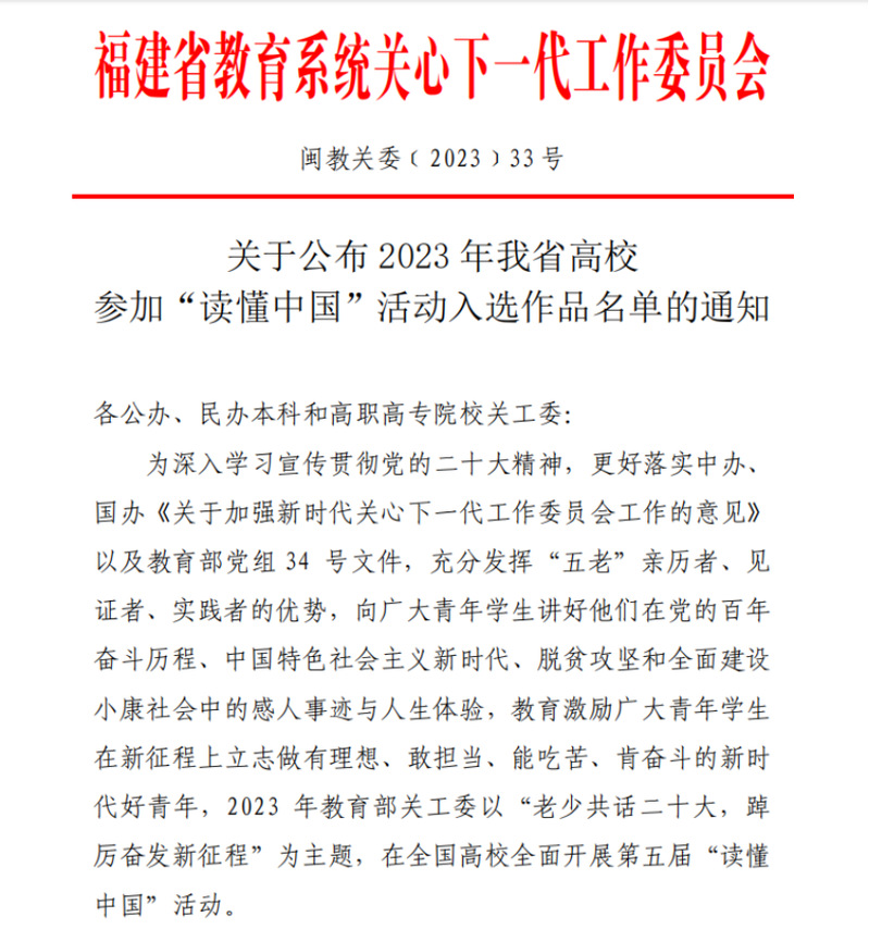 日前,福建省教育系統(tǒng)關(guān)工委公布了2023年我省高校參加“讀懂中國”活動(dòng)入選作品名單,我院關(guān)工委榮獲全省優(yōu)秀組織獎(jiǎng),微視頻《“船”承人》成功入選全省最佳“讀懂中國”微視頻作品,《學(xué)習(xí)貫徹二十大,紅色校史砥礪行》榮獲全省優(yōu)秀“讀懂中國”微視頻作品,2篇學(xué)生征文入選全省優(yōu)秀征文作品。