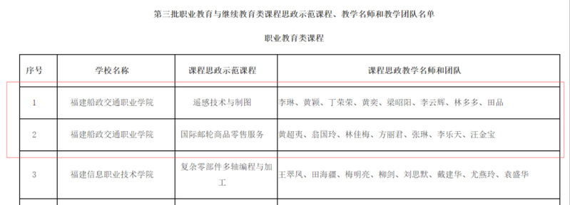近日,福建省教育廳公布第三批課程思政示范項目(職業(yè)教育與繼續(xù)教育類)名單,我院《遙感技術與制圖》《國際游輪商品零售服務》2門課程獲批省級課程思政示范課程。
