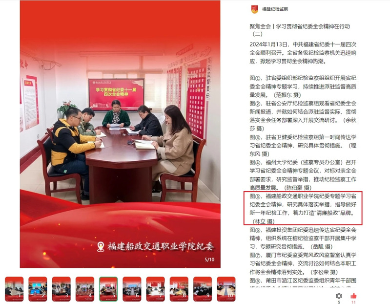 1月17日,福建省紀委監(jiān)委官網(wǎng)、福建紀檢監(jiān)察微信公眾號報道學院紀委專題學習省紀委十一屆四次全會精神,內(nèi)容如下: