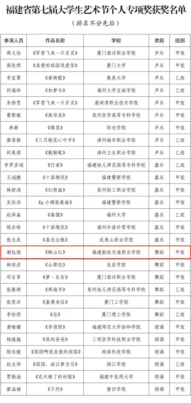 福建省第七屆大學生藝術節(jié)展演活動獲獎名單近日公布。大藝展由福建省教育廳主辦,三年舉辦一次,本屆藝術節(jié)以“厚植家國情懷,涵養(yǎng)進取品格”為主題。我院精心準備,選送了4個項目參加福建省第七屆大學生藝術節(jié)展演,斬獲6項榮譽,其中一等獎1項并入圍國賽角逐,二等獎2項,三等獎1項,學院榮獲優(yōu)秀組織獎,1位學生獲個人專項獎。