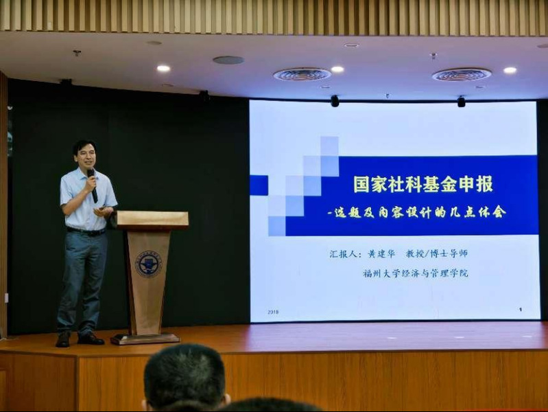 活動邀請了福州大學經(jīng)濟與管理學院黃建華教授作主題講座。黃建華教授是福州大學物流研究院副院長、福建省高層次人才、博士生導師,國家社科基金通訊評審專家,福建省、湖南省、河北省、江西省等省份的自然科學基金項目函評專家;兼任教育部學位中心博士論文、碩士論文評審專家,福建省政府投資項目評審專家、福州市發(fā)改委項目評審專家;福建省應急廳應急管理專家。講座以“國家社科基金申報”為題,為參會的博士教師們作了精彩報告。黃教授圍繞國家社科基金項目的指南走向、選題原則、論證活頁和申報書撰寫技術細節(jié)等視角展開分享。他強調雖然國社科從課題指南發(fā)布到提交時間比較短,但中標的課題一定是一個長期思考與積累的結果。他鼓勵與會教師,將個人學術研究興趣與國家和社會發(fā)展相融合,積極申報,反復打磨,爭取盡早取得突破。