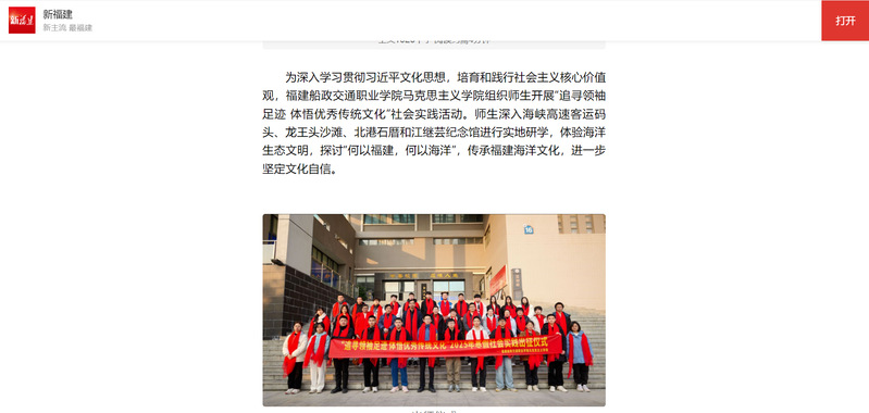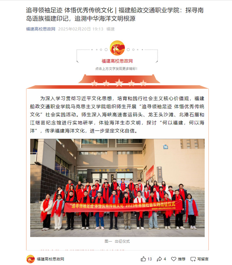 近日,新福建、高校思政網(wǎng)等主流媒體平臺報道我院開展“追尋領袖足跡 體悟優(yōu)秀傳統(tǒng)文化”社會實踐活動。