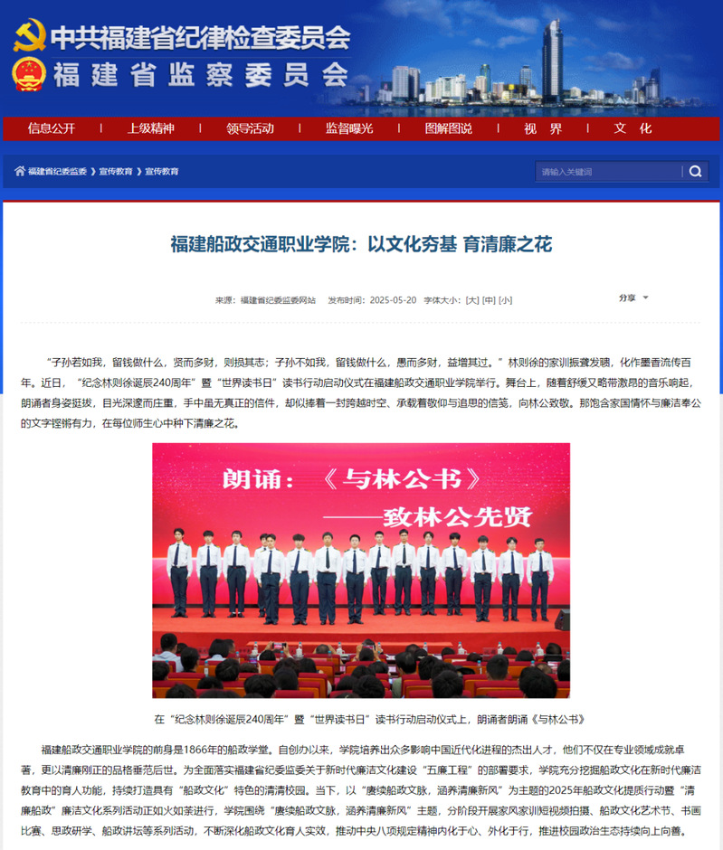 福建船政交通職業(yè)學(xué)院的前身是1866年的船政學(xué)堂。自創(chuàng)辦以來(lái),學(xué)院培養(yǎng)出眾多影響中國(guó)近代化進(jìn)程的杰出人才,他們不僅在專業(yè)領(lǐng)域成就卓著,更以清廉剛正的品格垂范后世。為全面落實(shí)福建省紀(jì)委監(jiān)委關(guān)于新時(shí)代廉潔文化建設(shè)“五廉工程”的部署要求,學(xué)院充分挖掘船政文化在新時(shí)代廉潔教育中的育人功能,持續(xù)打造具有“船政文化”特色的清清校園。當(dāng)下,以“賡續(xù)船政文脈,涵養(yǎng)清廉新風(fēng)”為主題的2025年船政文化提質(zhì)行動(dòng)暨“清廉船政”廉潔文化系列活動(dòng)正如火如荼進(jìn)行,學(xué)院圍繞“賡續(xù)船政文脈,涵養(yǎng)清廉新風(fēng)”主題,分階段開(kāi)展家風(fēng)家訓(xùn)短視頻拍攝、船政文化藝術(shù)節(jié)、書畫比賽、思政研學(xué)、船政講壇等系列活動(dòng),不斷深化船政文化育人實(shí)效,推動(dòng)中央八項(xiàng)規(guī)定精神內(nèi)化于心、外化于行,推進(jìn)校園政治生態(tài)持續(xù)向上向善。