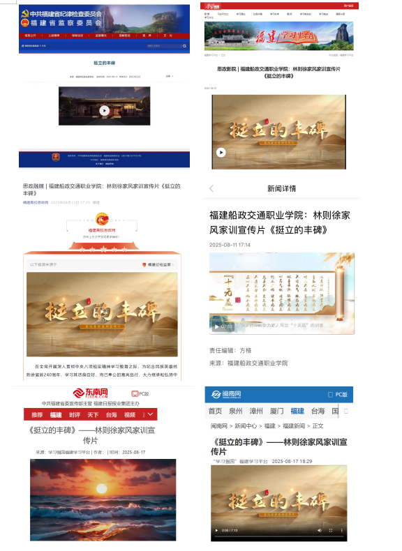 為深入學(xué)習(xí)貫徹習(xí)近平總書記關(guān)于注重家庭家教家風(fēng)建設(shè)的重要論述,在全黨開展深入貫徹中央八項(xiàng)規(guī)定精神學(xué)習(xí)教育之際,由福建省紀(jì)委監(jiān)委駐省教育廳紀(jì)檢監(jiān)察組、林則徐基金會指導(dǎo),我院紀(jì)委傾力打造的林則徐家風(fēng)家訓(xùn)宣傳片《挺立的豐碑》,被福建省紀(jì)委監(jiān)委網(wǎng)站、學(xué)習(xí)強(qiáng)國、新福建、福建高校思政網(wǎng)等主流媒體平臺刊播。