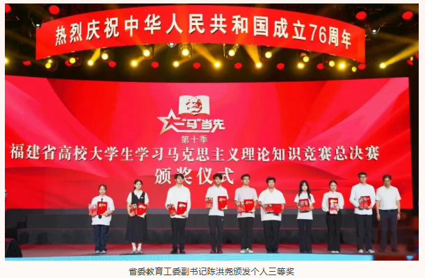 為深入學習貫徹習近平總書記關于學校思政課建設的重要指示精神,貫徹落實全國、全省教育大會精神,堅持不懈用習近平新時代中國特色社會主義思想鑄魂育人,9月27日,由中共福建省委宣傳部、中共福建省委教育工委主辦,福建省高校思想政治理論課教學指導委員會、福建教育電視臺承辦的第十季福建省高校大學生學習馬克思主義理論“一‘馬’當先”知識競賽總決賽在福建農林大學成功舉辦。我院黨委書記陳宜大攜師生代表參與活動。
