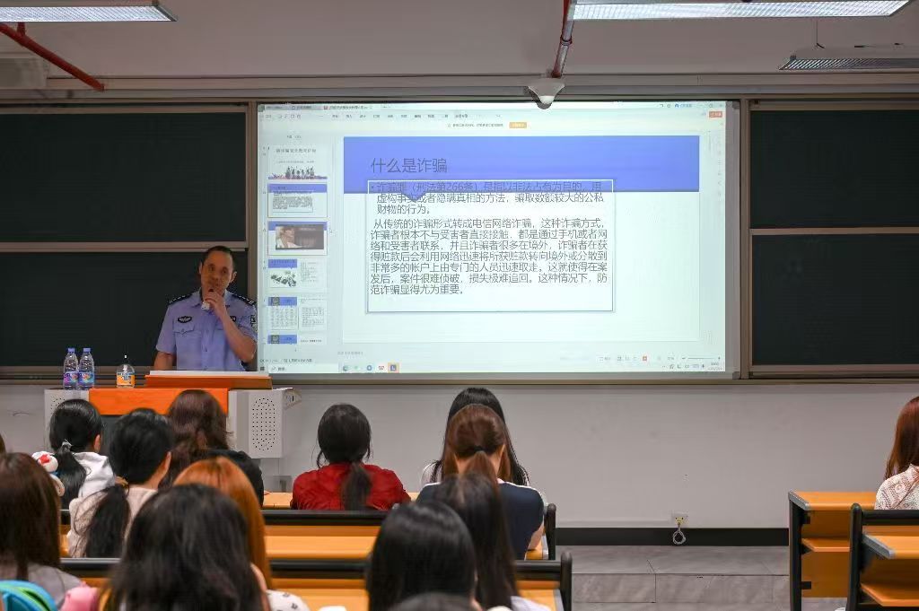 為提升學生電信網絡詐騙防范意識,2025年9月24日,經濟與管理學院特邀對湖派出所吳恒強警官開展防電信詐騙宣傳專題講座,全院百余名學生現(xiàn)場聆聽。