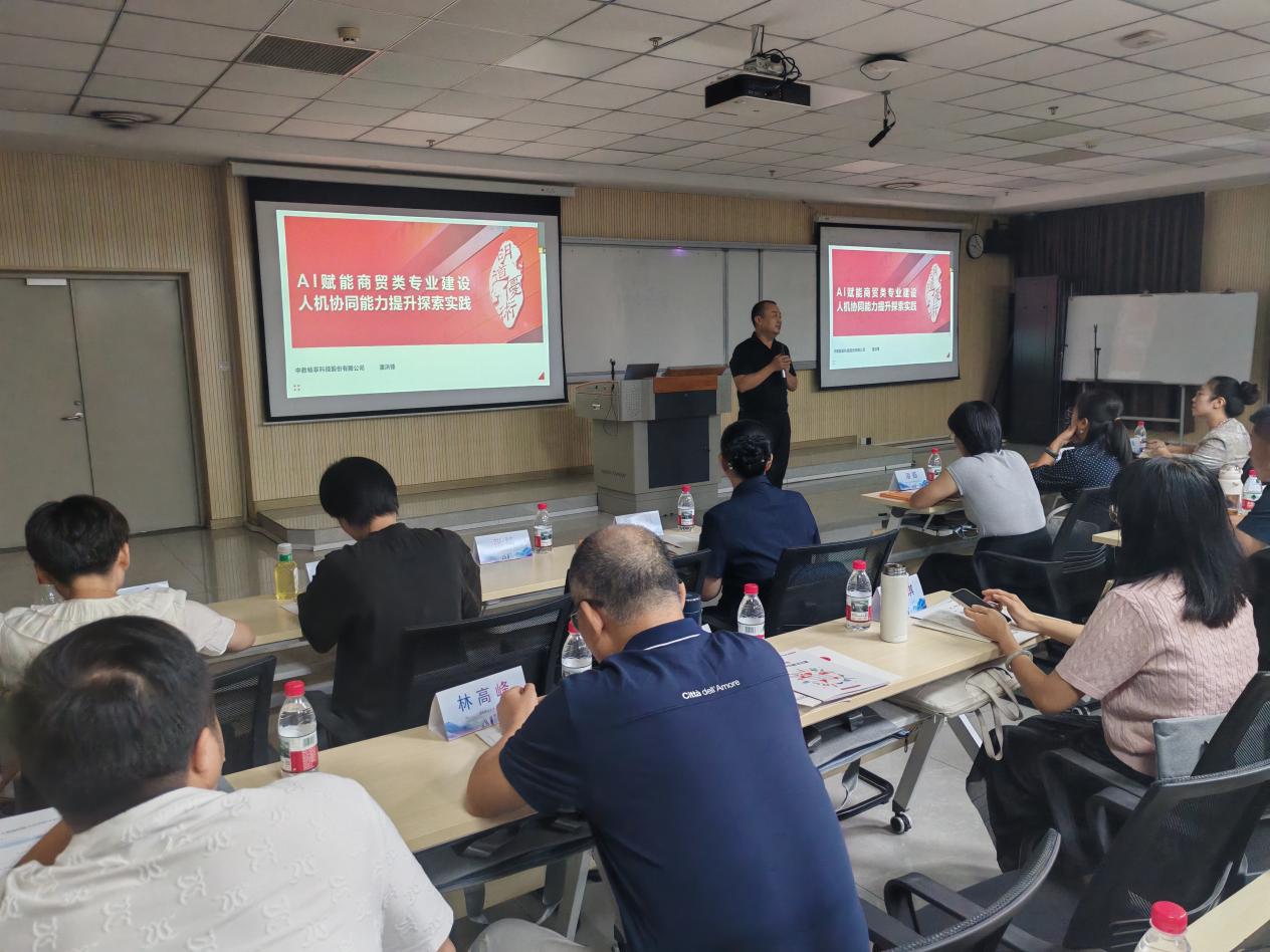 隨后的研討會上,中教暢享科技股份有限公司副總經(jīng)理潘洪鋒先生作了題為《AI賦能商貿(mào)類專業(yè)建設(shè)—人機(jī)協(xié)同能力提升探索與實踐》的主旨報告。潘總從產(chǎn)業(yè)視角出發(fā),深入分析了人工智能在商貿(mào)領(lǐng)域的應(yīng)用趨勢及其對崗位能力要求帶來的變化,系統(tǒng)闡述了如何利用AI技術(shù)賦能專業(yè)內(nèi)涵建設(shè)、課程體系重構(gòu)、教學(xué)資源開發(fā)以及學(xué)生人機(jī)協(xié)作能力培養(yǎng),并分享了企業(yè)在相關(guān)領(lǐng)域的探索經(jīng)驗與成功實踐,為院校推進(jìn)教學(xué)改革提供了寶貴的思路借鑒。