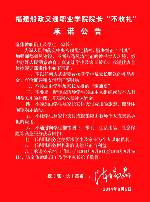 福建船政交通職業(yè)學(xué)院院長“不收禮”承諾公告