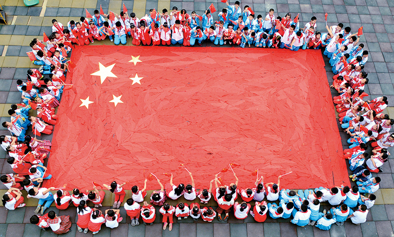社會主義辦學(xué)方向是我國教育最鮮亮的底色,我國教育要培養(yǎng)的是社會主義建設(shè)者和接班人,這是個根本性的問題。圖為山東省沂源縣荊山路小學(xué)開展“紅領(lǐng)巾拼國旗祝福祖國迎國慶”活動,學(xué)生們在老師帶領(lǐng)下用紅領(lǐng)巾拼出了一面巨型國旗,表達(dá)對偉大祖國的祝福。(教育部供圖)
