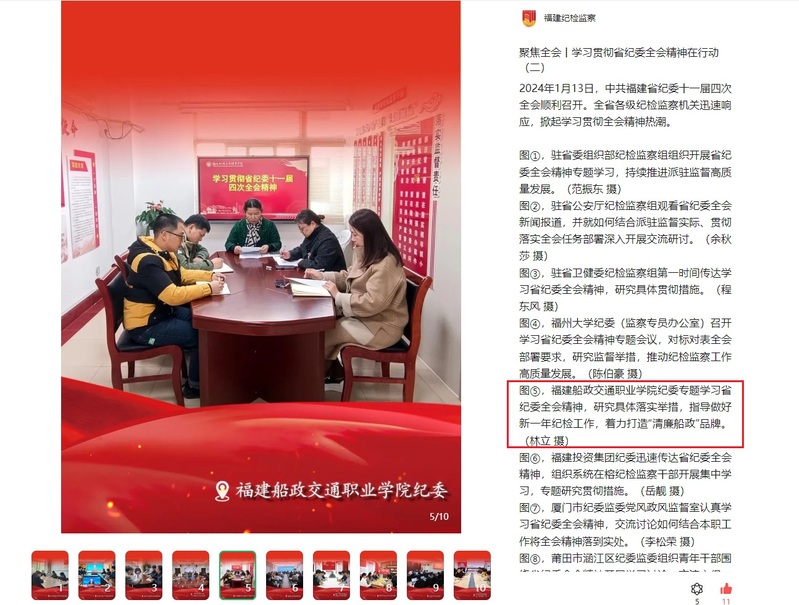 2024年1月17日,福建省紀委監(jiān)委官網(wǎng)、福建紀檢監(jiān)察微信公眾號報道學(xué)院紀委專題學(xué)習(xí)省紀委十一屆四次全會精神,內(nèi)容如下:
