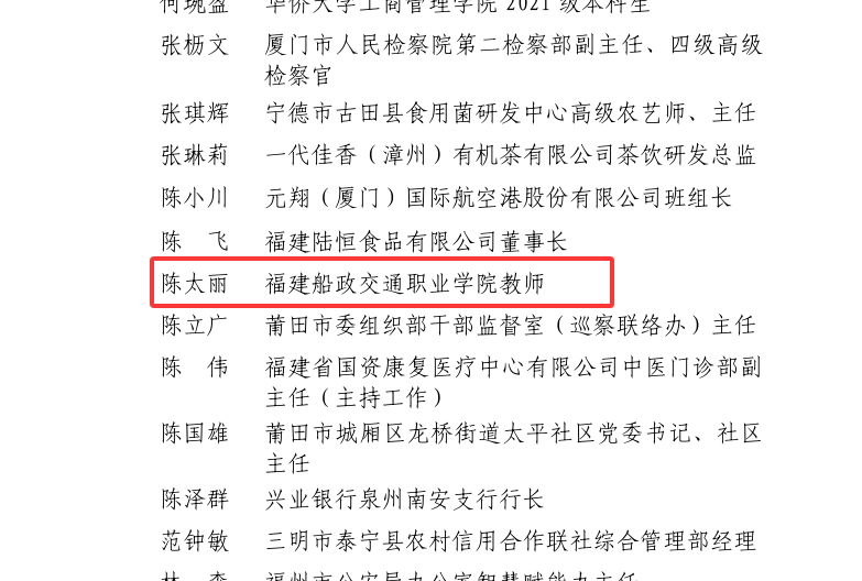 近日,共青團(tuán)福建省委公示2025年度福建青年五四獎(jiǎng)?wù)?、福建新時(shí)代青年先鋒、福建省五四紅旗團(tuán)委(團(tuán)支部)、福建省優(yōu)秀共青團(tuán)員、福建省優(yōu)秀共青團(tuán)干部表彰對(duì)象。我院教師陳太麗獲評(píng)“2025年度福建省新時(shí)代青年先鋒”榮譽(yù)稱號(hào),特此祝賀!