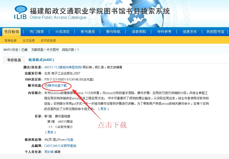 我館現(xiàn)已實(shí)現(xiàn)覆蓋館藏的隨書光盤等非書資源智能下載鏈接,下載資源與圖書進(jìn)行匹配對接,讀者不需要安裝插件或客戶端軟件,就可以實(shí)現(xiàn)在瀏覽器中直接查看光盤所有內(nèi)容,也可以在窗口中實(shí)現(xiàn)光盤中個(gè)別文件單獨(dú)下載和在線觀看。讀者只需進(jìn)行以下簡單的操作:打開我館圖書館網(wǎng)頁→進(jìn)入館藏書目查詢→檢索想要查找的書目→點(diǎn)擊相應(yīng)書名進(jìn)入書目詳細(xì)信息頁面→切換到卡片格式顯示→點(diǎn)擊隨書光盤下載→選擇想要下載的內(nèi)容播放下載或全盤下載。