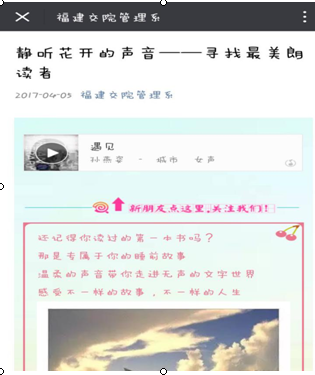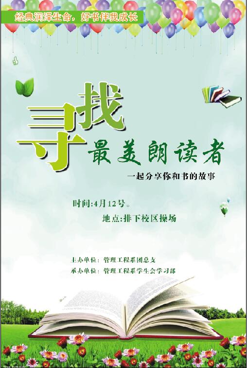 為了大力響應(yīng)國家關(guān)于全民閱讀的號召,傳播社會主義先進文化,提高廣大船政學子的文化素質(zhì),濃厚校園學習氛圍,形成我院學生良好的學習風氣,展現(xiàn)船政學子的風采,樹立良好的社會形象,引導大家走進閱讀社會,共享閱讀快樂,多讀書,讀好書,與好書相伴,學院圖書館于2017年4月1日至4月20日期間,在全院范圍內(nèi)開展“福建船政交通職業(yè)學院圖書館讀書日2017世界詩歌日特別活動”。作為活動分會場,管理工程系于2017年4月12日在排下校區(qū)操場舉辦了“尋找最美朗讀者”活動。