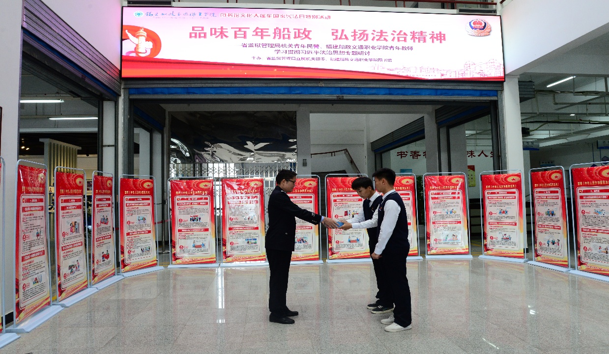 2020年12月7日,值此第七個國家憲法日到來之際,福建船政交通職業(yè)學院圖書館文化大篷車舉行國家憲法日特別活動——學習貫徹習近平法治思想專題研討活動。省監(jiān)獄管理局機關(guān)刑罰執(zhí)行處副處長吳建山向我院學生贈送憲法宣傳冊。