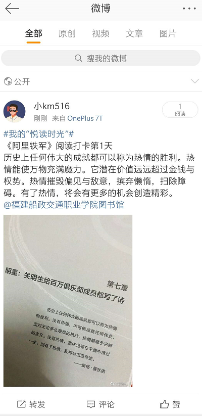 保持每日閱讀,同時(shí)記錄閱讀中使你有所感觸的內(nèi)容及感想,以文字或拍照的形式進(jìn)行新浪微博打卡,注明你所閱讀的書(shū)籍名稱(chēng)以及打卡天數(shù),并選擇話題留言